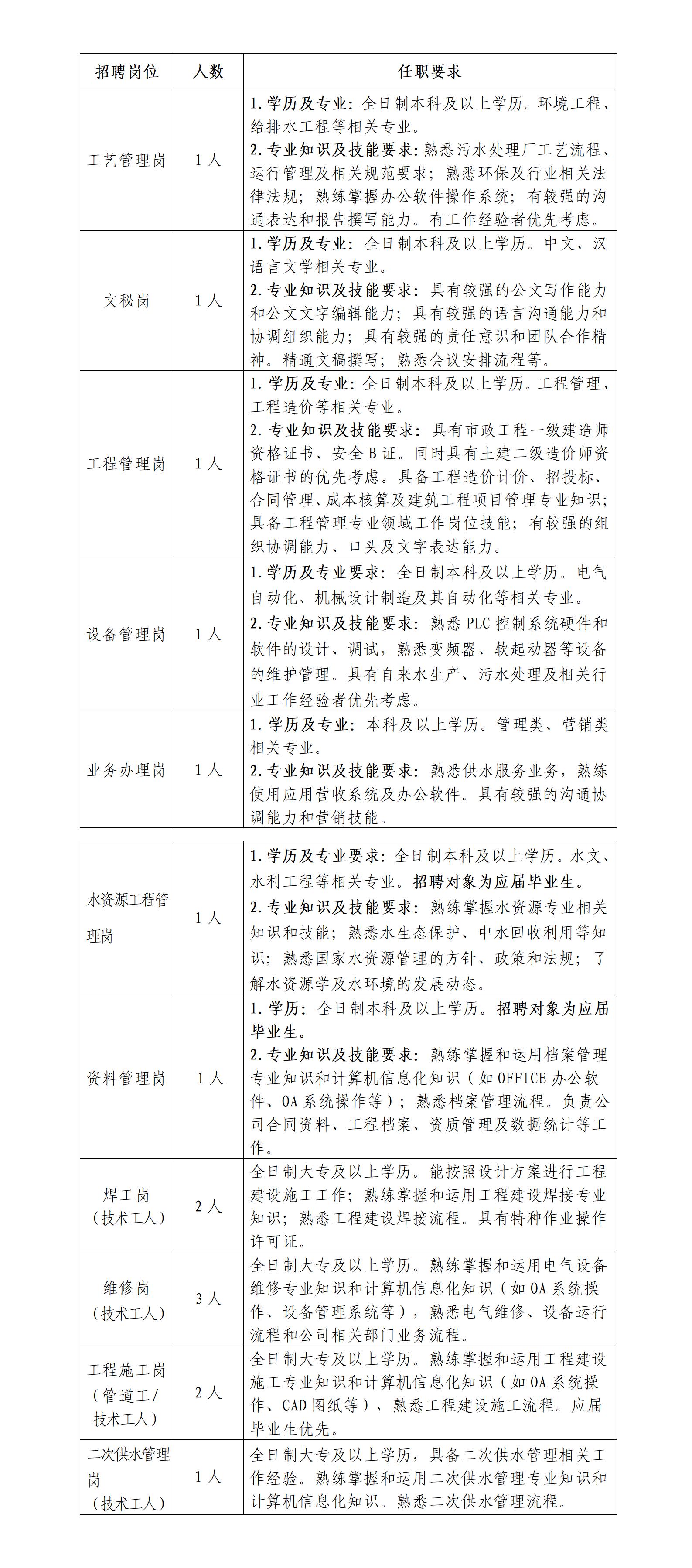 內(nèi)江市水務(wù)有限責(zé)任公司系內(nèi)江市國資委所屬內(nèi)江投資控股集團(tuán)有限公司的全資子公司。是集城市供水、污水處理、供排水工程設(shè)計、工程施工為一體的國有獨資市政公用骨干企業(yè)。為滿足公司高質(zhì)量發(fā)展對人才的需求,特面向社會公開招聘相關(guān)人員。現(xiàn)將招聘事項公告如下。