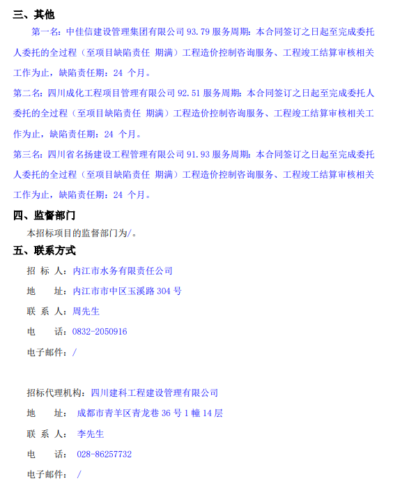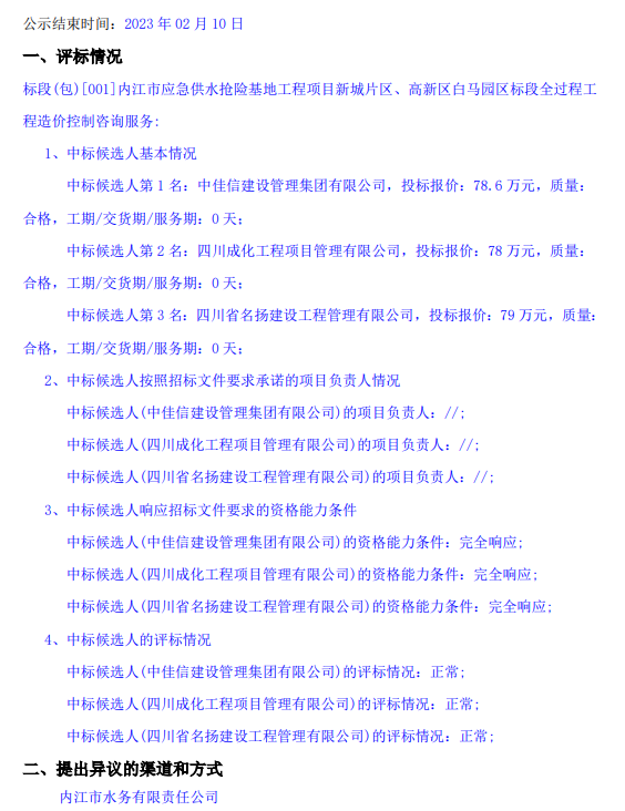 內(nèi)江市應急供水搶險基地工程項目新城片區(qū)、高新區(qū)白馬園區(qū)標段全過程工程造價控制咨詢服務中標候選人公示