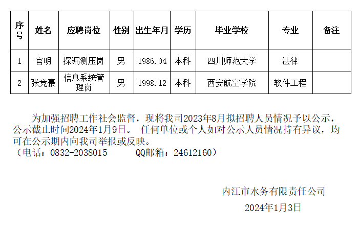 內(nèi)江市水務(wù)有限責任公司2024年1月擬招聘人員公示