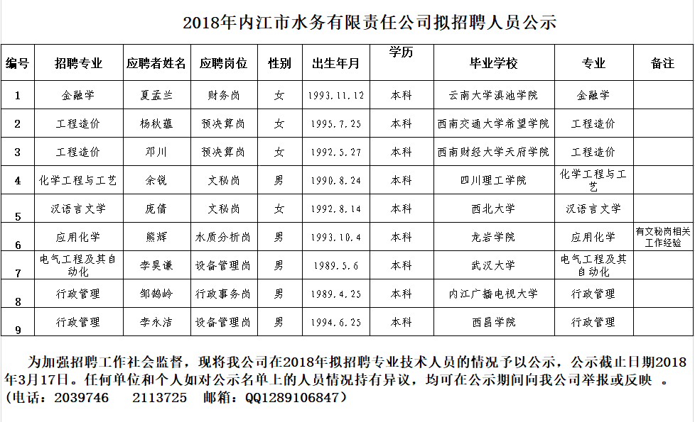 2018年內(nèi)江市水務有限責任公司擬招聘人員公示