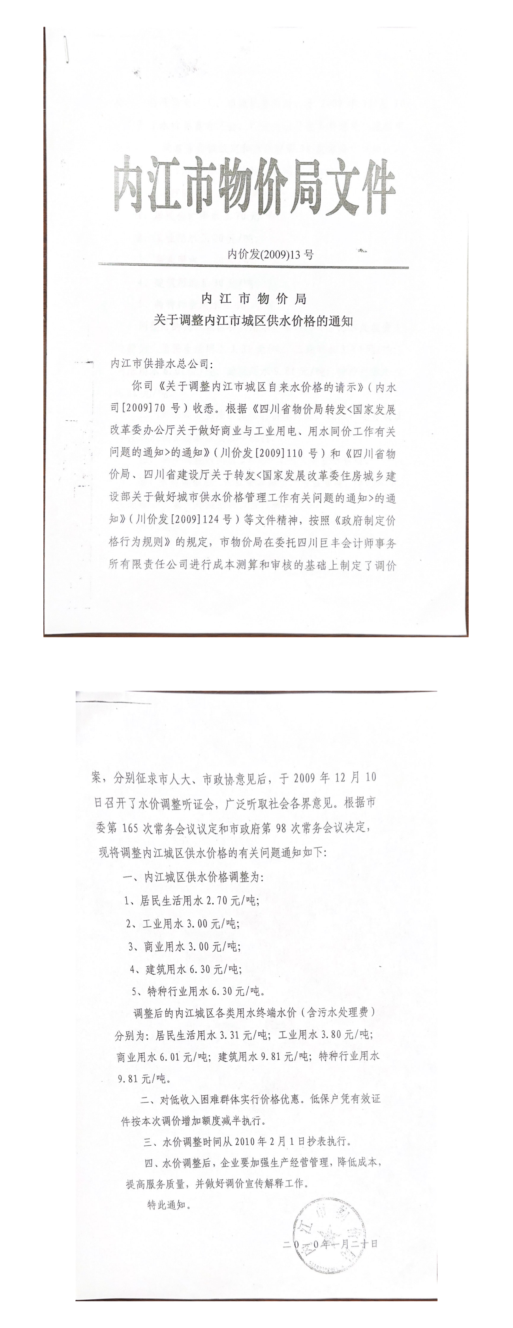內(nèi)江市物價(jià)局關(guān)于調(diào)整內(nèi)江市城區(qū)供水價(jià)格的通知